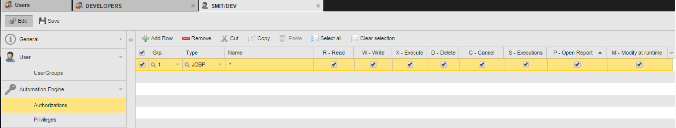 For example, user SMIT has been granted full rights to the JOBP (Workflow) object type. This is how it looks like in the Administration perspective: