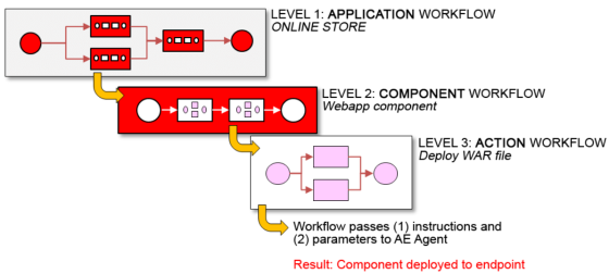 Combines and orchestrates different component workflows for a complete end-to-end Application deployment. You can use them for installations, updates; and un-installations of one or more Components that are involved in a deployment for a certain Application. To provide a clear structure that is easier to build and monitor, Application Workflows are made up of two kinds of Workflows: