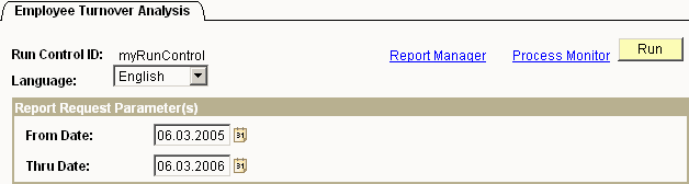 A user wants to process the SQR report Employee Turnover Analysis, creating the Run Control myRunControl. After adding the Run Control, the parameter fields required for the report are entered and stored. The relevant fields are FROM_DATE and THRU_DATE.