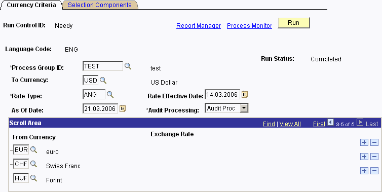 The following example shows a Run Control for currency conversion. In this case, fields and values are provided in list form (currency list).