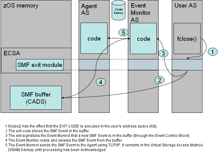 The following illustration shows how the Agent, Event Monitor and SMF Exit communicate with each other: