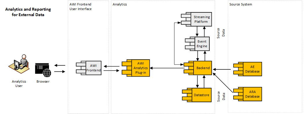 Data is collected in defined intervals by the Analytics Backend and stored in the Analytics datastore. The Analytics Backend retrieves the statistical data from the datastore and computes the indicator values for the dashboards which can be viewed by a registered user via the AWI accessing a configured Analytics client.