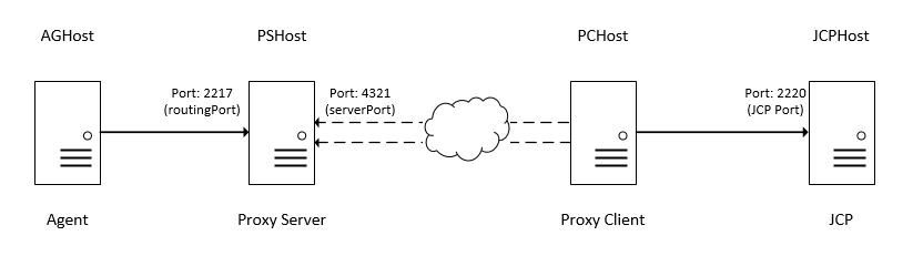 Note: Nested Proxies are not supported. For example, it is not possible to route an agent over two Proxies: Agent > Proxy Server < Proxy Client > Proxy Server < Proxy Client > JCP process.