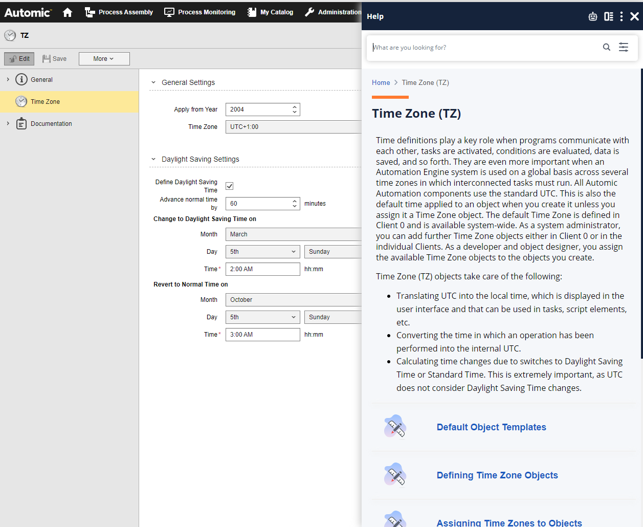 This opens Automic Automation Help on the right-hand side. The panel displays in-context help that is relevant to the part of AWI that you have opened it from. For example, this is what you see when you open the Automic Automation Help to the main definition page of a Time Zone object: