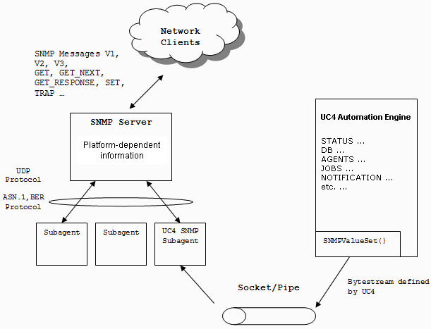 SNMP can be used to monitor the various conditions which occur within an AE system. Its activities include monitoring the availability of the Automation Engine and agents, active notifications or blocking tasks.
